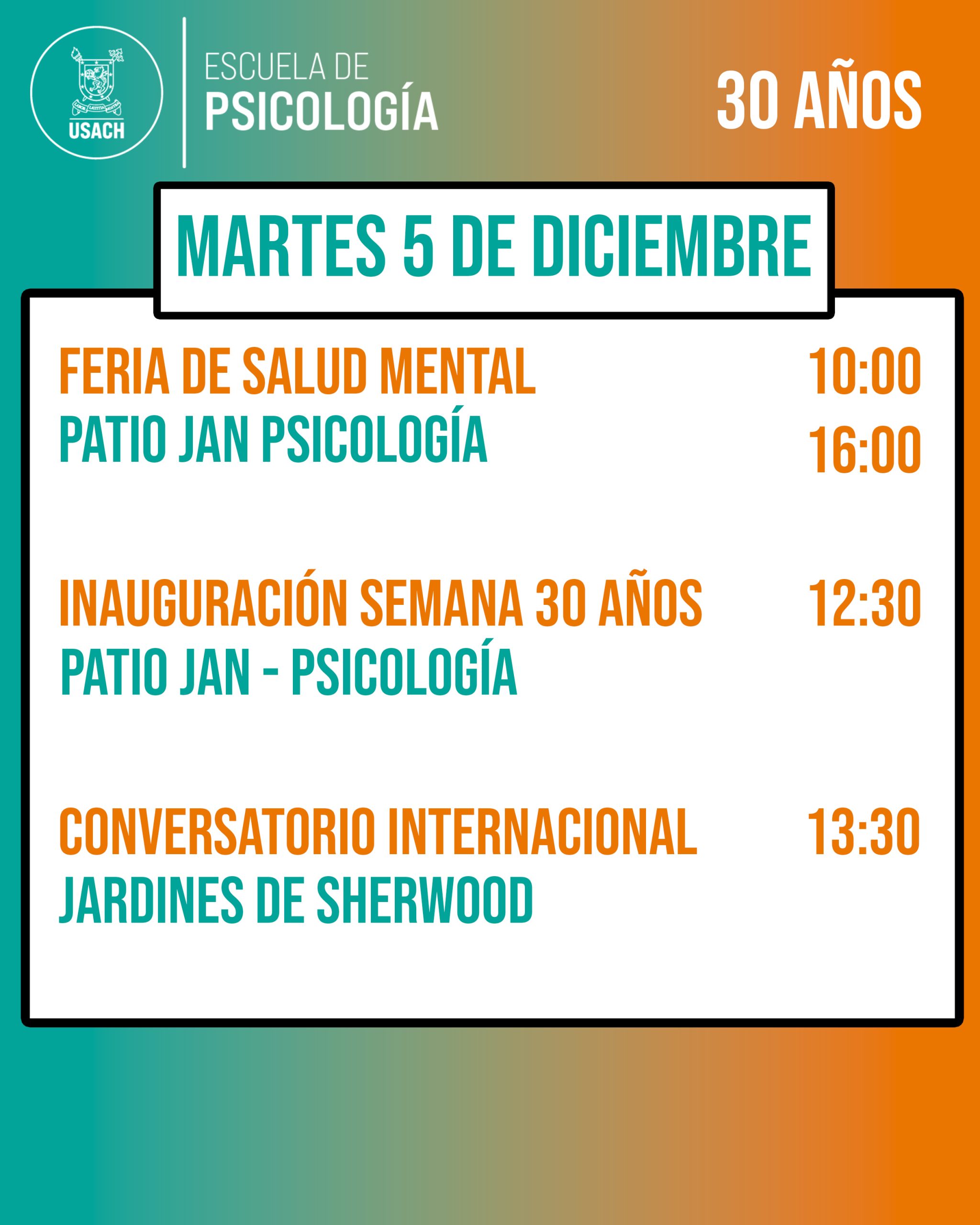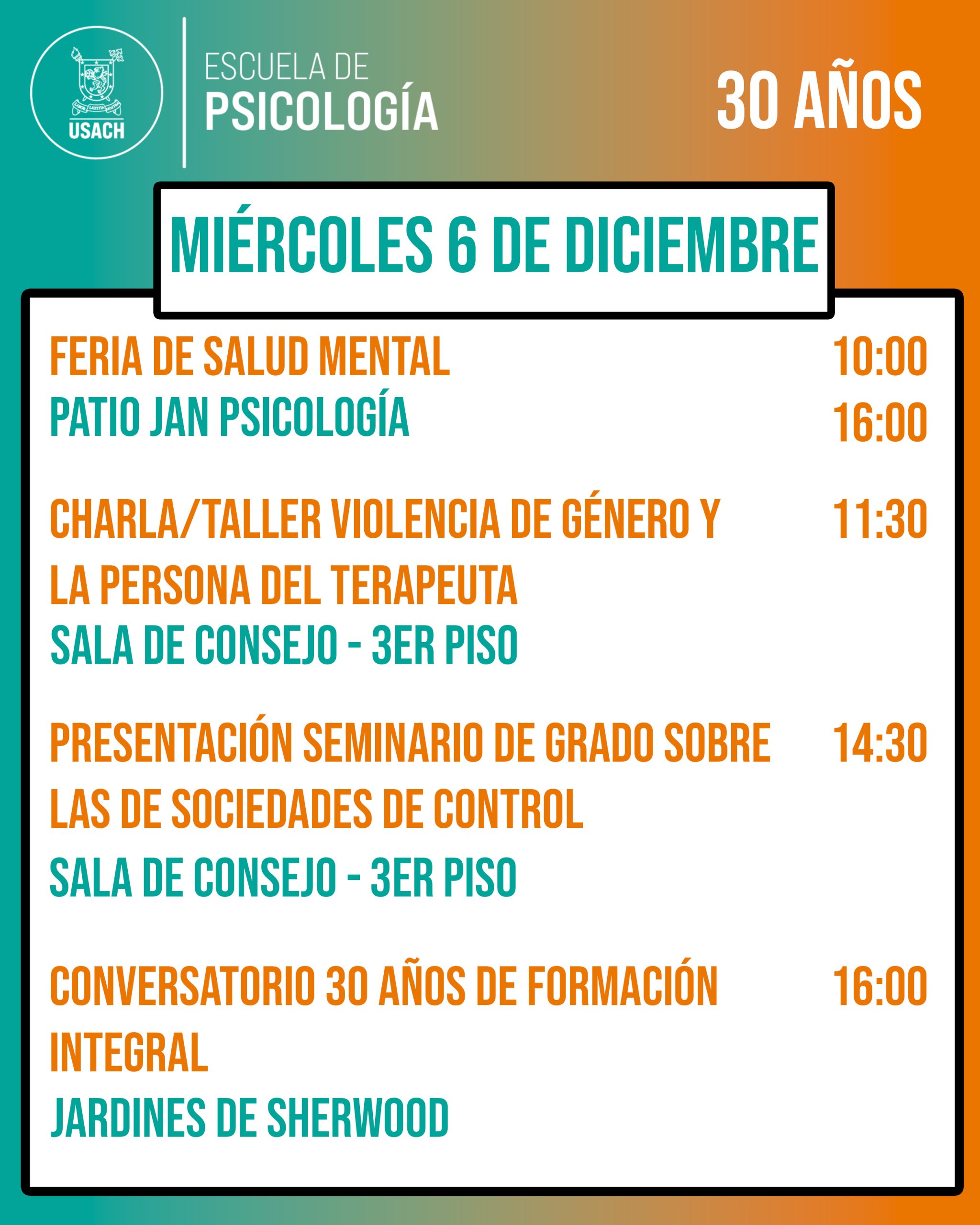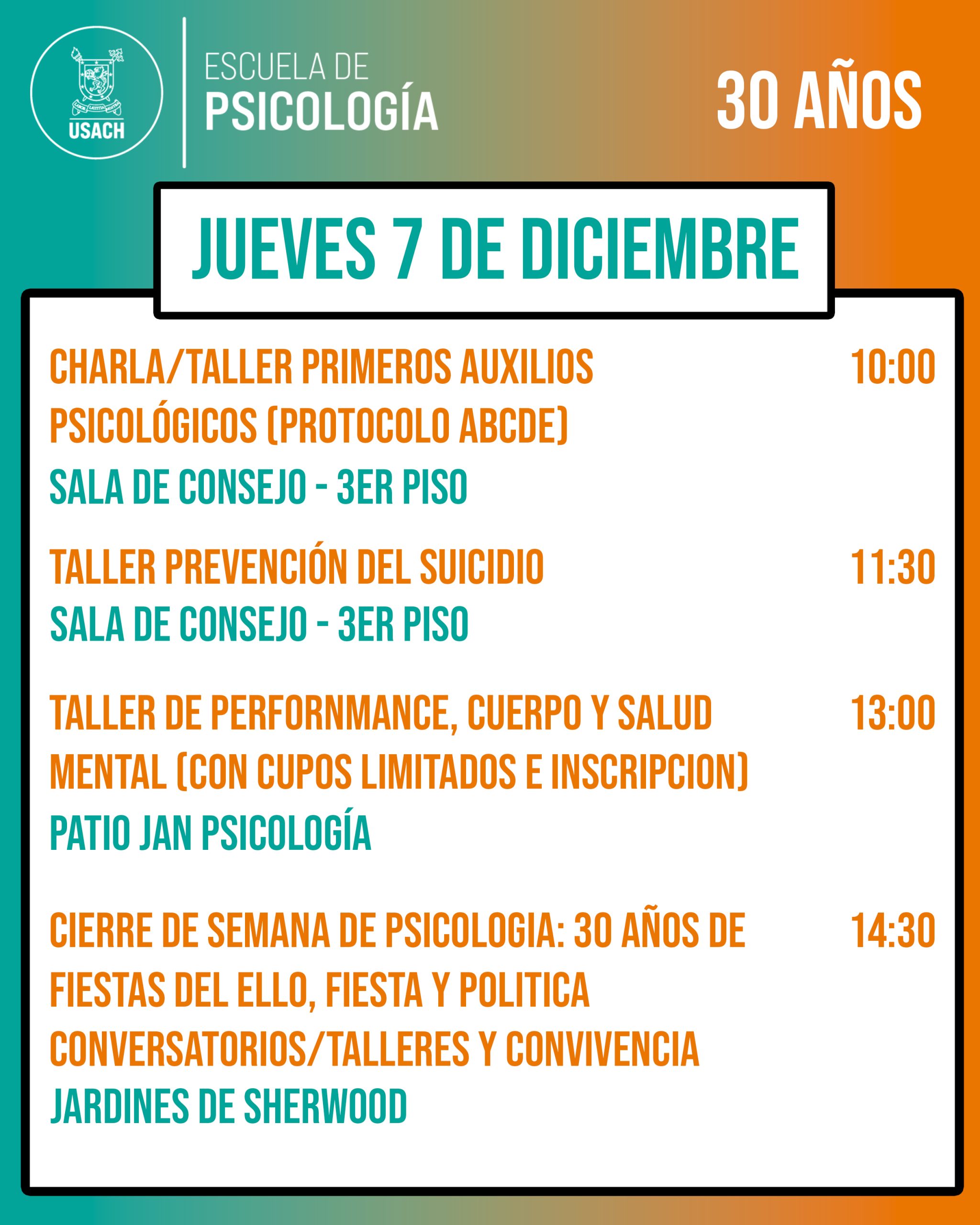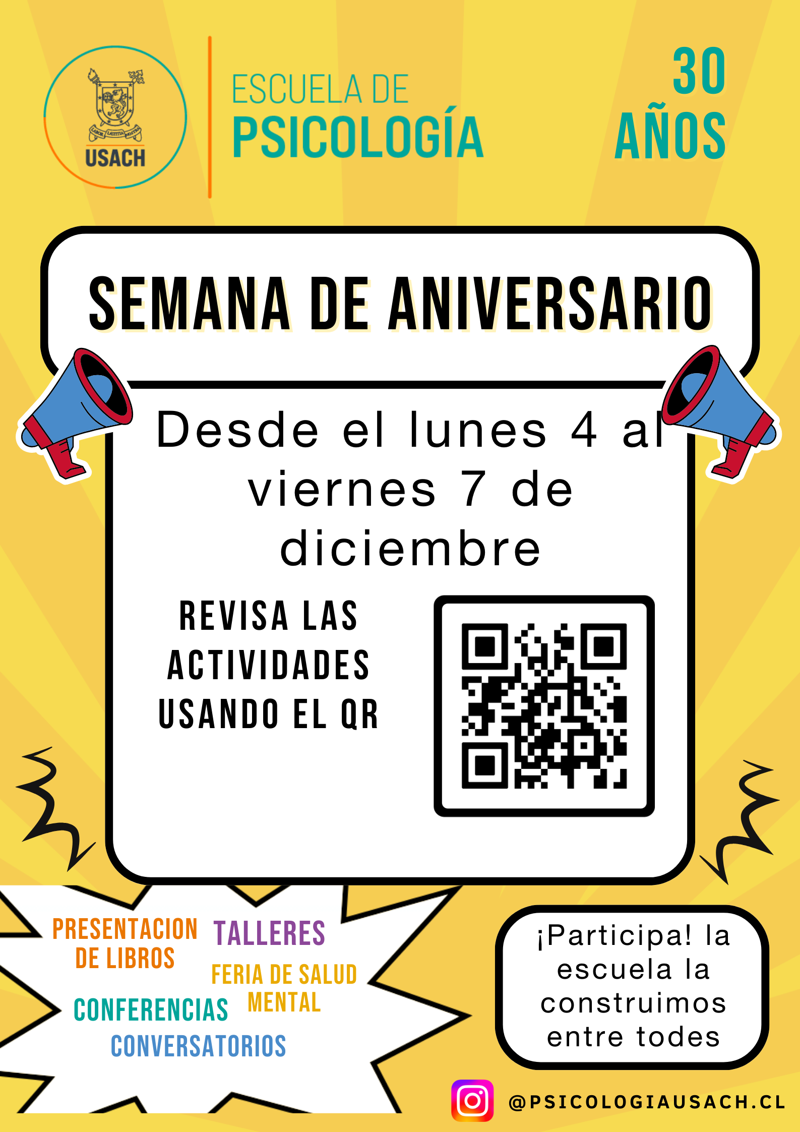 Desde el lunes 4 al jueves 7 de diciembre, celebraremos los 30 años de nuestra Escuela de Psicología.
