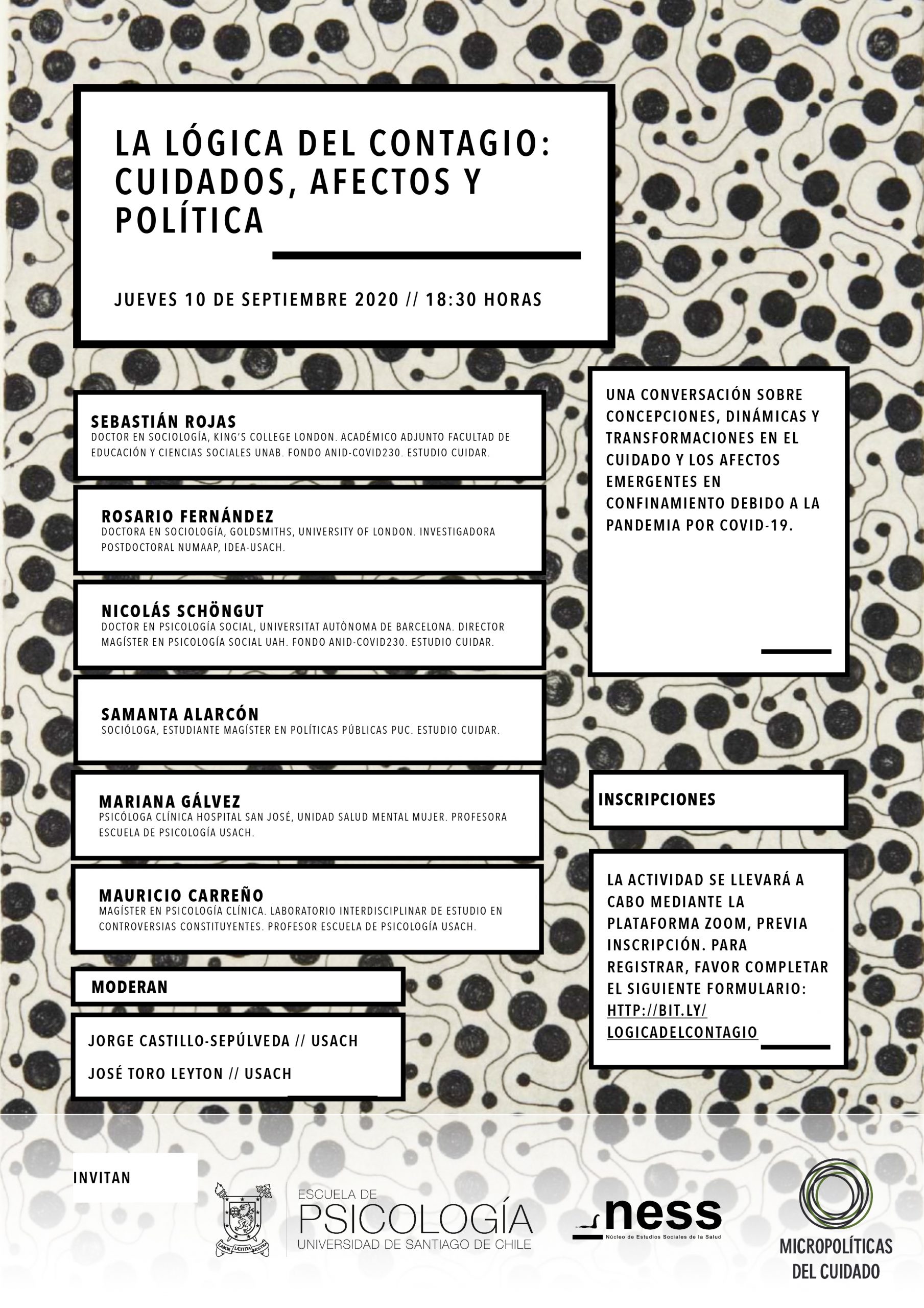 El conversatorio “Lógicas del Contagio: cuidados, afectos y política”, organizado por la Escuela de Psicología de la Universidad de Santiago, se realizará este jueves 10 de septiembre a partir de las 18:30 horas, a través de la plataforma Zoom y contará con la participación de destacados académicos y profesionales del área.