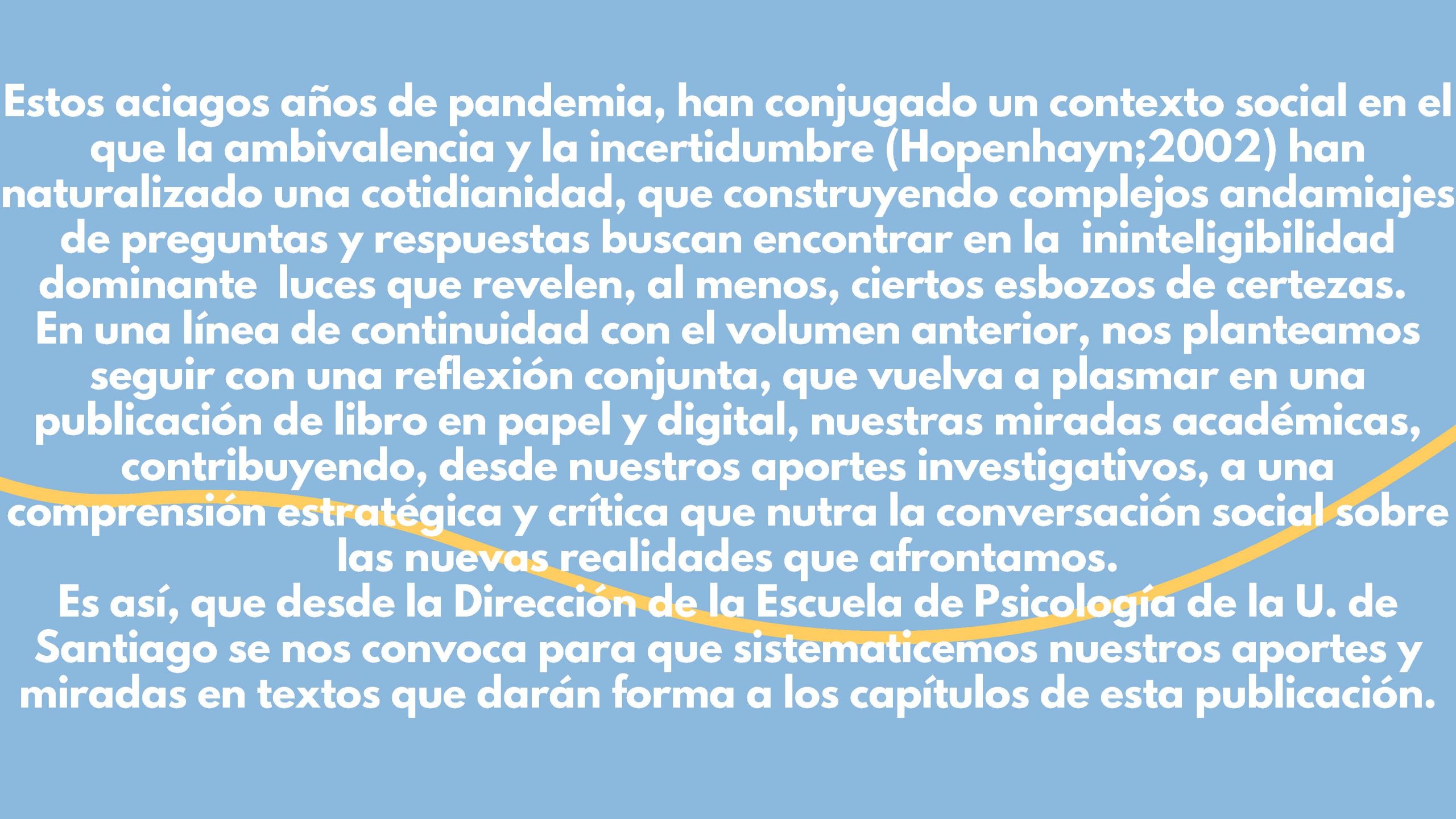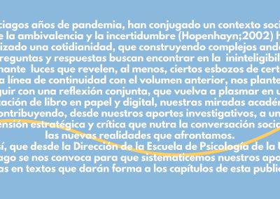 En los tiempos actuales de profundos y radicales cambios culturales se instalan en la agenda social temas emergentes que nos desafían a dar forma a un nuevo paradigma social complejo, poblado de inestabilidad, caducidad y competitividad que nos interpela con una serie de cambios que exigen gran capacidad de adaptación para desenvolverse en épocas de incertidumbre. Estamos dramáticamente demandados por los movimientos sociales, la inestabilidad política y las emergencias sanitarias. El llamado de esta segunda publicación, no solo nos refiere al tema de la pandemia, hablamos más bien de sindemia, noción que incluye tres vértices conformados por: la crisis sanitaria, la conflictividad social y el cambio climático con sus efectos múltiples.