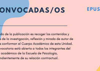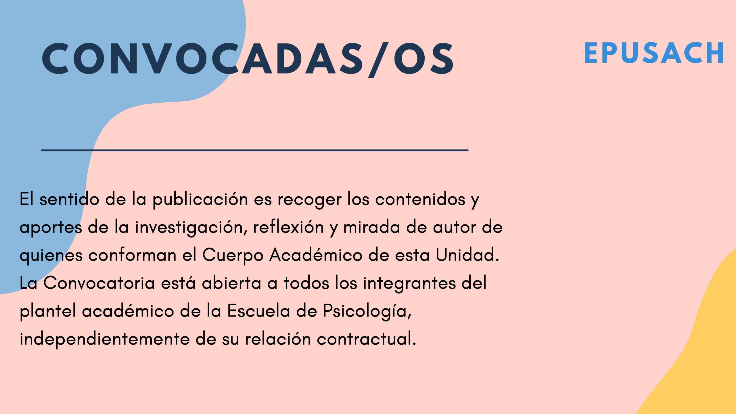 El sentido de la publicación es recoger los contenidos y aportes de la investigación, reflexión y mirada de autor de quienes conforman el Cuerpo Académico de esta Unidad. La Convocatoria está abierta a todos los integrantes del plantel académico de la Escuela de Psicología, independientemente de su relación contractual.