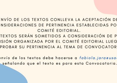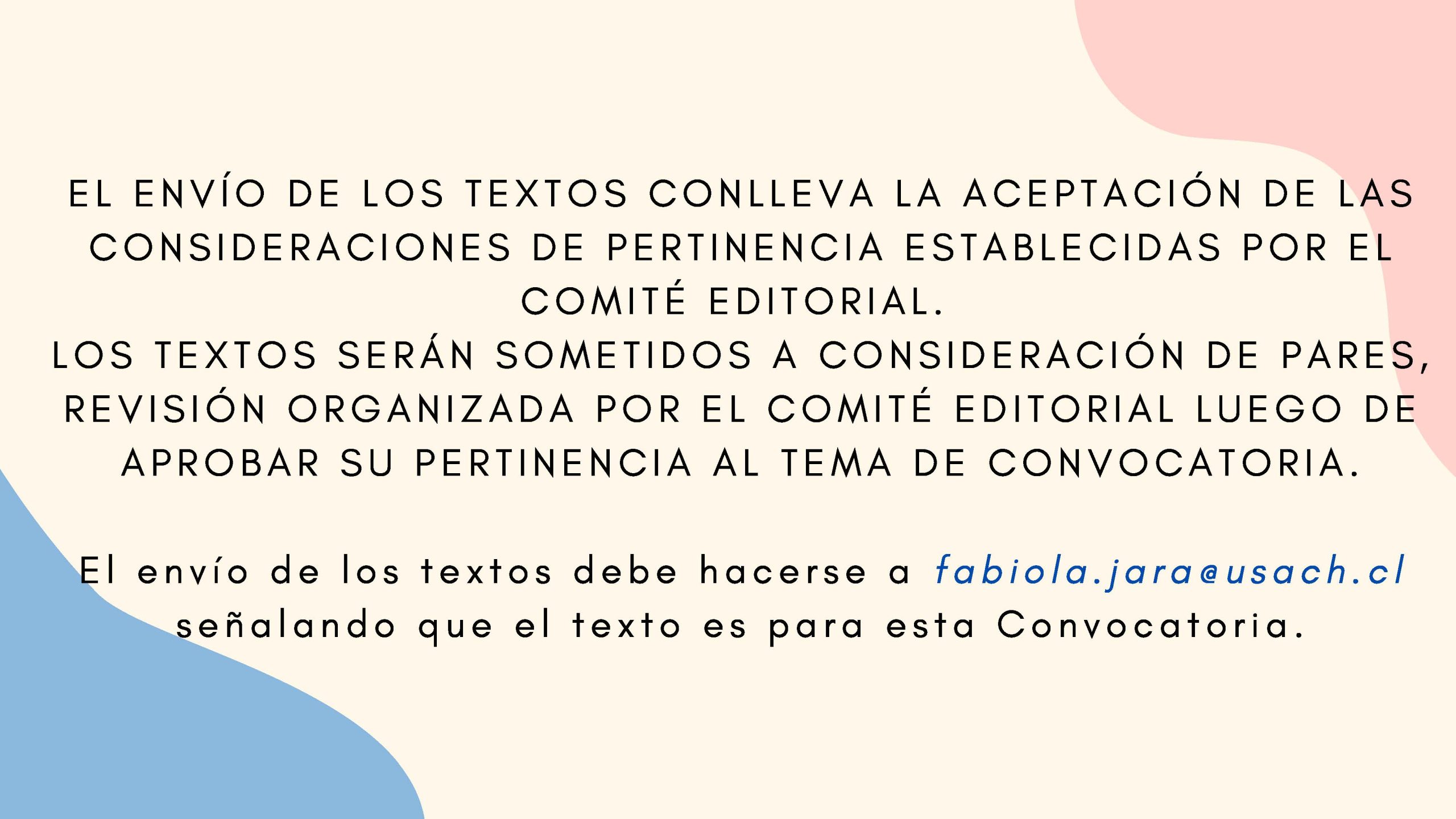 Los textos serán sometidos a consideración de pares, revisión organizada por el comité editorial luego de aprobar su pertinencia al tema de la convocatoria. El envío de los textos se debe hacer a fabiola.jara@usach.cl , señalando que el texto es para esta convocatoria.