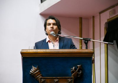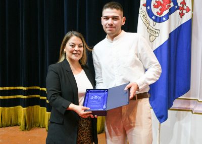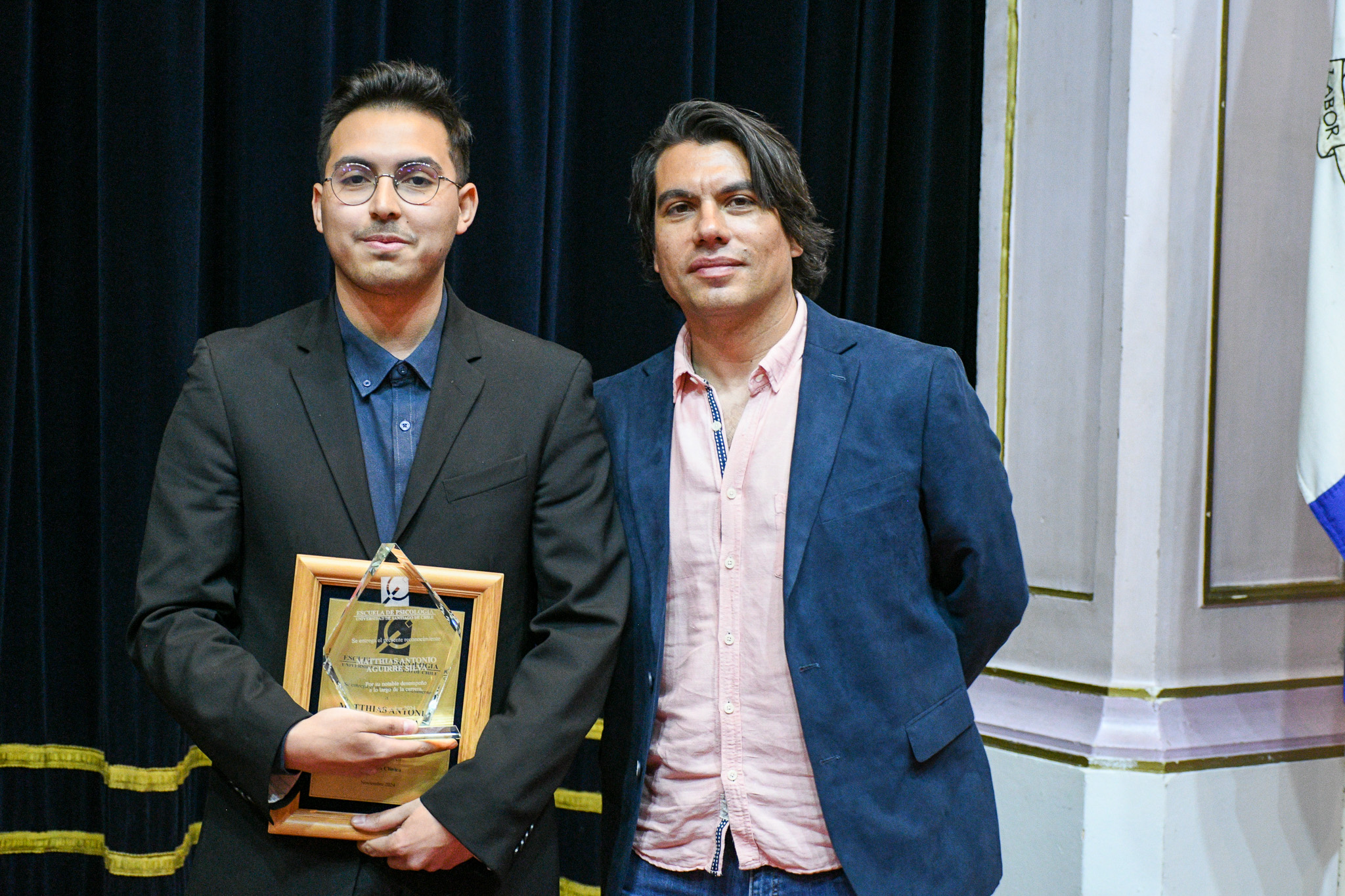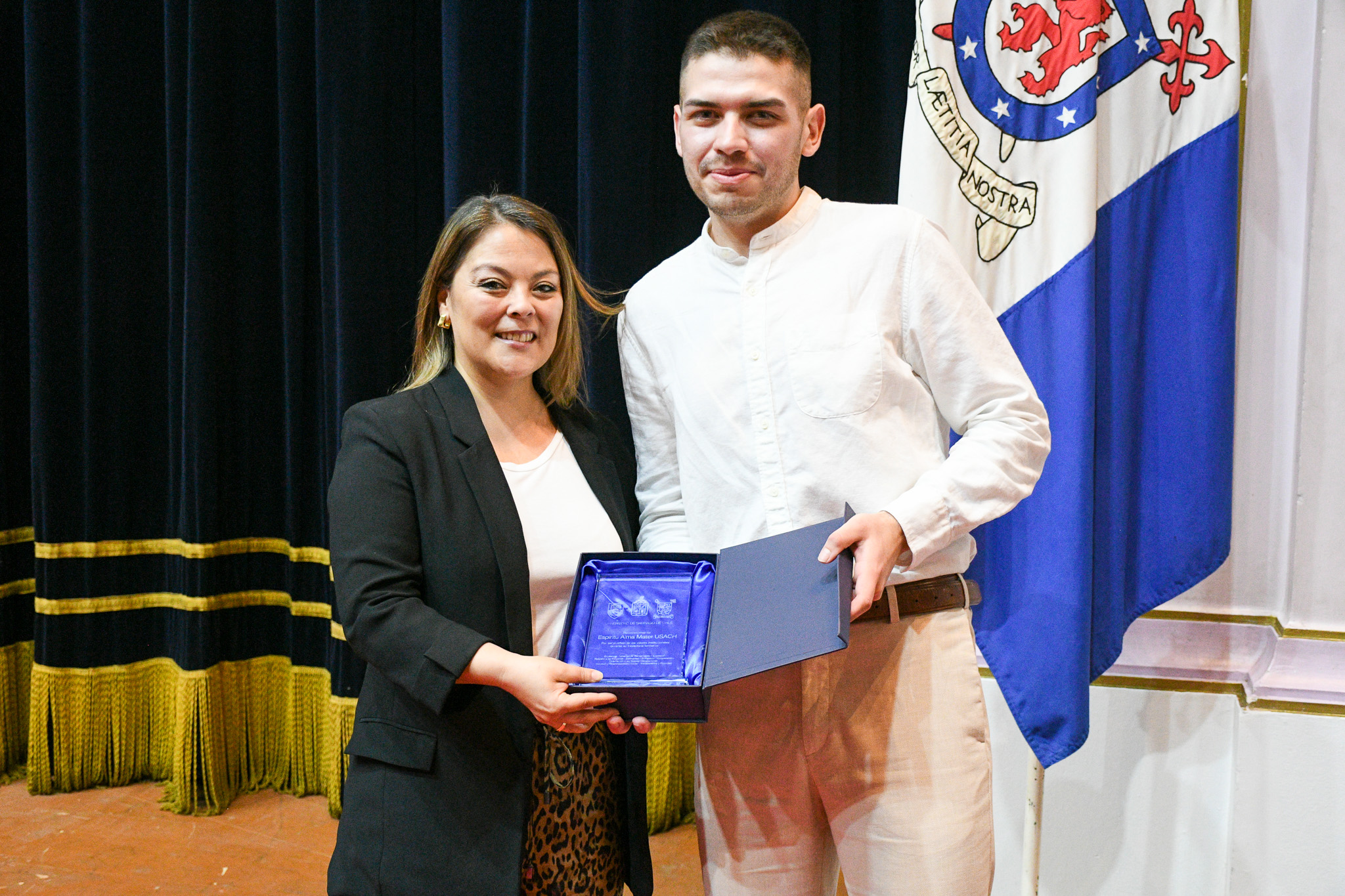 El Premio Alma Mater de la Universidad de Santiago fue otorgado a Nicolás Ignacio Alviña Fuentes, en reconocimiento por representar los valores de la universidad. Al reflexionar sobre su formación en la USACH, Nicolás destacó la “experiencia de aprendizaje constante” que vivió a lo largo de la carrera, enfrentándose a diversos desafíos, como el estallido social y la pandemia. «Uno parte de miradas más tradicionales… pero creo que en el poco andar de la carrera y en la medida que también vamos explorando y experimentando esta experiencia, el mismo estallido, la misma pandemia, uno empieza también a encontrarse en eso», comentó, resaltando cómo la formación en la USACH impulsa a los estudiantes a desarrollar una mirada crítica y reflexiva frente a la psicología y su práctica. Además, animó a los jóvenes a unirse a esta institución: «Lo que tiene de particular la USACH es que te enseña a situarte… la formación no solamente está pensada desde entregar las herramientas técnicas y teóricas, sino que también en otorgar herramientas personales.»