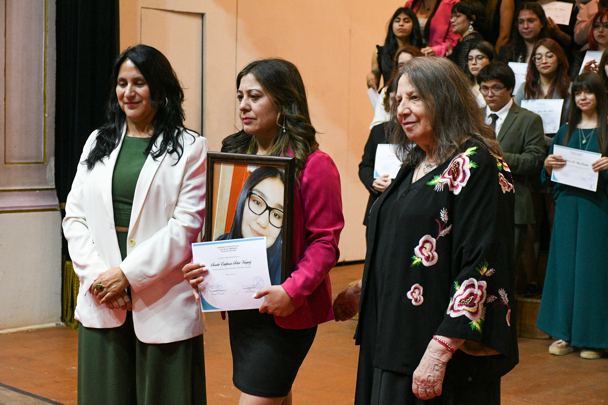 A continuación, se entregaron los diplomas a los titulados del Magíster en Psicología Educacional. En la ceremonia también se reconoció a los mejores estudiantes de cada especialidad. En Psicología Clínica, el reconocimiento fue otorgado a Constanza Dalia Morales Gárate; en Psicología del Trabajo y las Organizaciones, a Víctor Andrés Vargas González; y en Psicología Educacional, a Matthias Antonio Aguirre Silva, quien además fue distinguido como el mejor alumno de su generación.